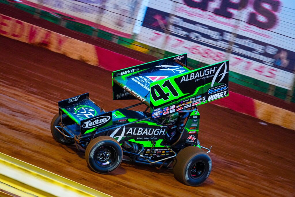 The starting lineups for the four 10-lap Heat races posted in the pit area based on each driver’s best lap time in Honest Abe Roofing Qualifying. That put the Tarlton and Son/Complete Parts & Equipment Solutions/Boltz Family #41 Maxim in the first starting spot on the grid of The Greatest Store on Dirt Heat Race #4. He would pull the forty-one up on the inside of Brock Zearfoss #8 on the front row with Ashton Torgerson in the Shark Racing #1a and Dylan Norris #17N following in row two. Pacing together in row three were Sheldon Haudenschild in the NOS Energy Drink #17 and Matt Campbell #X with Gerard McIntyre #2M and Kyle Moody #99M in row four. Lucas Wolfe #5W, Chris Arnold #23A, and Olivia Thayer #39T filled out the starting grid rolling in rows five and six, respectively.