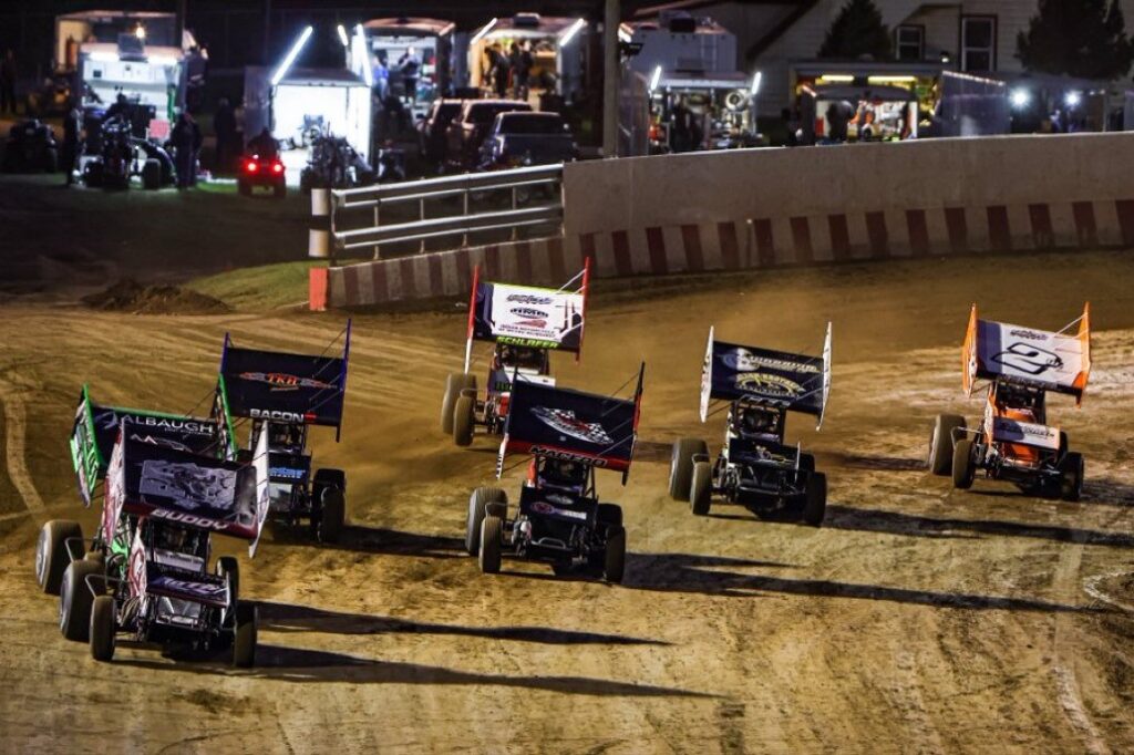 There were six transfer spots in each Heat race up for grabs, so when the green flag dropped it was all business. Pacing slowly down the frontstretch, the flagman gave the competitors the one-to-go signal indicating that when they reached the chalk stripe in turn four the next time by it was hammer down time. Polesitter Buddy Kofoid arrived and instantaneously mashed the gas pedal. The race was on with Carson tucking in behind Kofoid on the low side entering turn one. They raced down the back straightaway in front of the red and white candy cane painted walls as they entered the last sets of turns. At the end of the first lap, it was three Californians out in front of the pack – Buddy Kofoid, Carson Macedo, and Cole Macedo – with Brady Bacon, Scott Neitzel, and Skylar Gee running behind them.